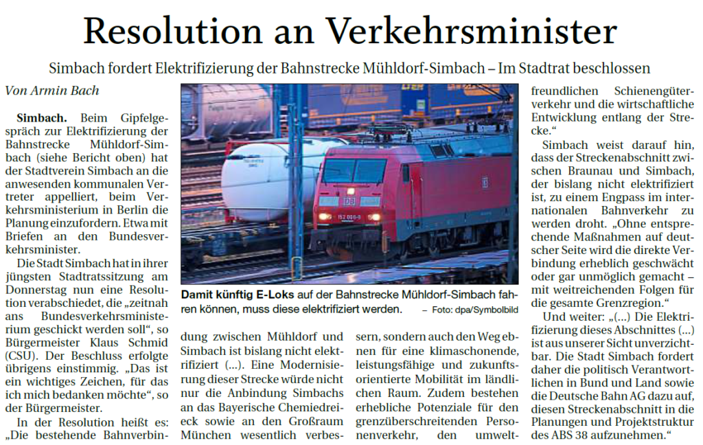 • In dem Rundbrief des Fahrgastverbands ProBahn war der Ausbau der Bahnstrecke Mühldorf-Simbach a.Inn Thema